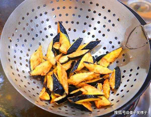 ,茄子炸酥,炸成金黄色时捞出来控油。