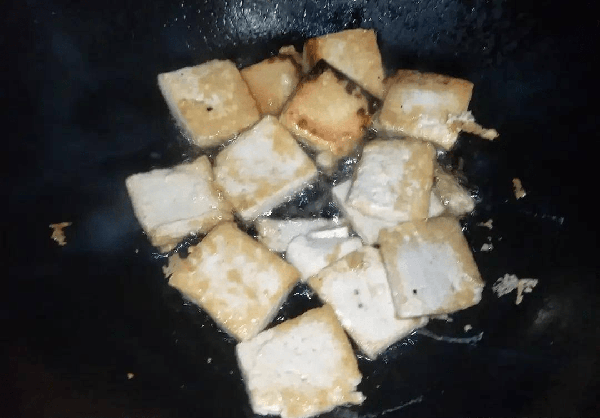 ③把豆腐煎到一面金黄色之后,就把它调到另一面去煎,继续煎成金黄色,之后把豆腐盛出来。