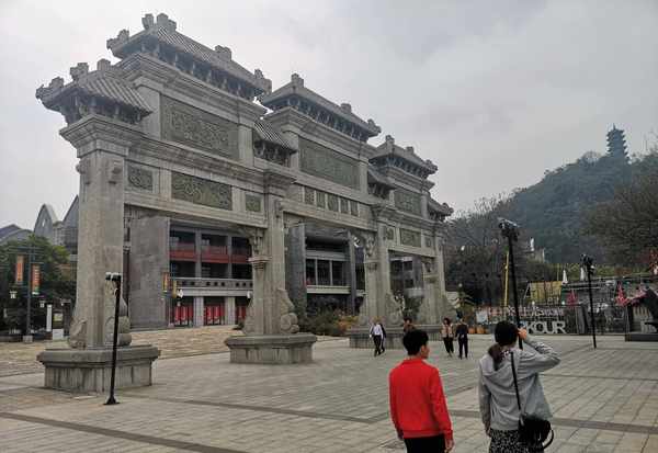 窑埠古镇的牌坊,山上耸立着宝塔,面向清澈碧绿的柳江,真是春风又绿江南岸!