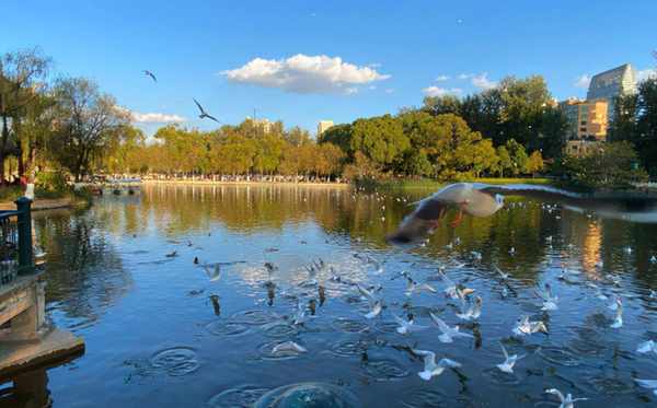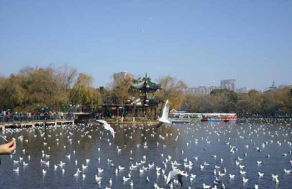 当然,翠湖的美景远不止这些,不知道大家有没有听说过,这里的热门景点“翠湖观鸥”。每到了11月至次年的3月雪白的红嘴鸥便成群结队的从西伯利亚到这里来过冬,从不间断。