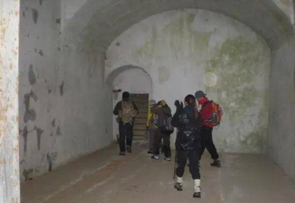 走出林海后,心情也轻松了很多。而且还看到了建大大山中的秘密军事基地。据老大介绍,这些基地都隐藏在大山之中,里面暗道几乎将整座山给掏空了,在以前这里都是军事禁区。那些入口都建有高大的水泥门,门高约6米,拱形,两扇对开,每扇门厚约30-40厘米,估计有几吨重。但大部分入口只有十几米深的通道,再往里都被用石头封死了,无法进入。但在一座山峰的东坡(自己感觉是东坡),却有三个相对集中的导弹发射洞口,里面有地道相连,而这座山就是目前最高的山了。
