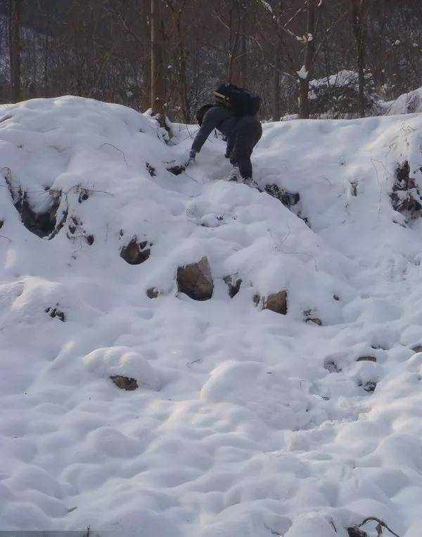 只要看过《林海雪原》这部片子,你就能理解我们的穿越之路,没看过的,你就尽可能的想象用雪把一座大山埋得严严实实的样子就行了。先是在满是槐树的山中前行,雪深及膝,根本没路,只能跟着老大踩出的脚印走。走出了槐树林后,又钻入松树林。寂静的大山中,只有我们一行驴友默默地前行,一会儿上坡,一会儿下坡,能听只要看过《林海雪原》这部片子,你就能理解我们的穿越之路,没看过的,你就尽可能的想象用雪把一座大山埋得严严实实的样子就行了。先是在满是槐树的山中前行,雪深及膝,根本没路,只能跟着老大踩出的脚印走。走出了槐树林后,又钻入松树林。寂静的大山中,只有我们一行驴友默默地前行,一会儿上坡,一会儿下坡,能听到的就是大家踩在雪窝里时发出的吱嘎声和积雪从树上下落时的索索声。