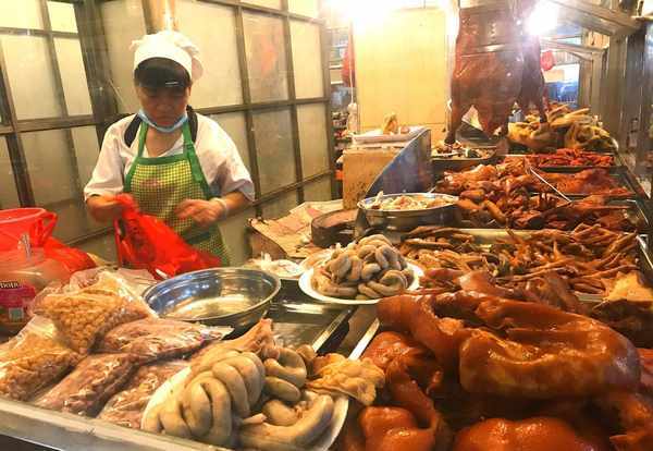 本地人的晚餐得多丰盛啊?在吃的方面花起钱来一点不含糊。市场里的熟食区,也是本地人最喜欢光顾的地方。腊肠、猪头肉、盐焗鸡、烤鸭,都是本地人喜欢吃的。连单价近百元的烤乳猪,也不乏消费者。有趣的是,本地人喜欢吃瘦一些的猪头肉,瘦的猪头肉似乎要贵一些。