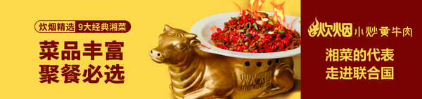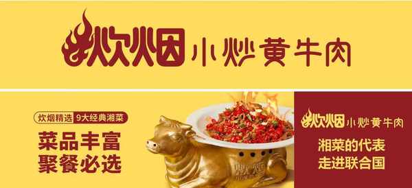 金牛黄点燃炊烟品牌LOGO,高贵典雅呼之欲出,这是中国经典色,代表炊烟对经典湘菜的不懈追求和精致打磨。