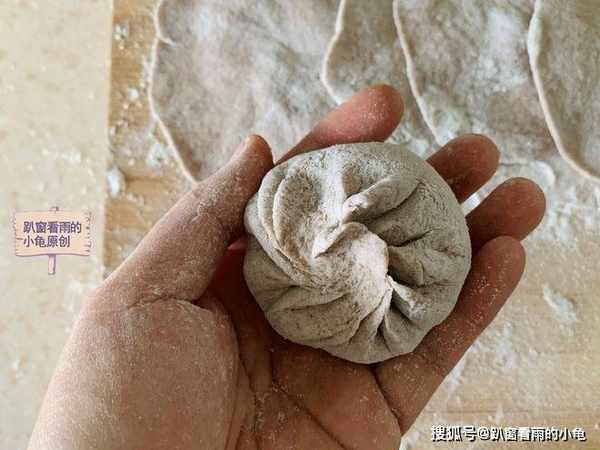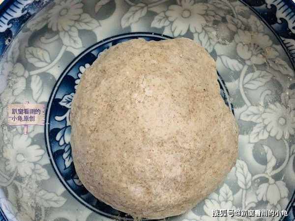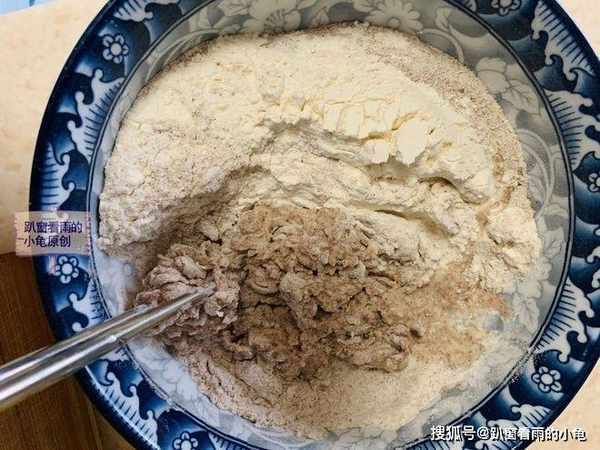 1:准备一个大碗,倒入1小碗面粉和1小碗黑麦面,混合均匀后,一半混合面粉中慢慢加入半小碗热水,用筷子搅成絮状,再在另一半混合面粉中慢慢加入半小碗凉水,也用筷子搅成絮状,然后用手将所有面絮揉成一个光滑的面团,盖上盖子,放置一旁,醒面二十分钟。