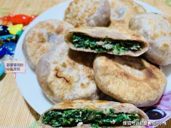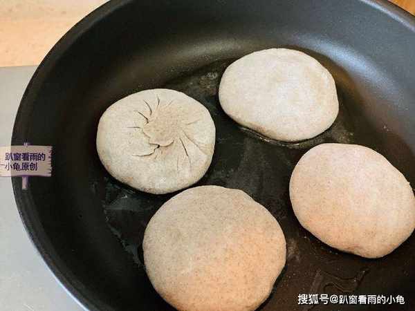 5:火上坐煎锅,锅热后倒入少许油,转小火,再将馅饼码入煎锅,盖好盖子,小火慢烙,过三分钟等底面煎至金黄后翻面,再烙三分钟后,等馅饼微微鼓起并且二面金黄,就可以出锅装盘了。