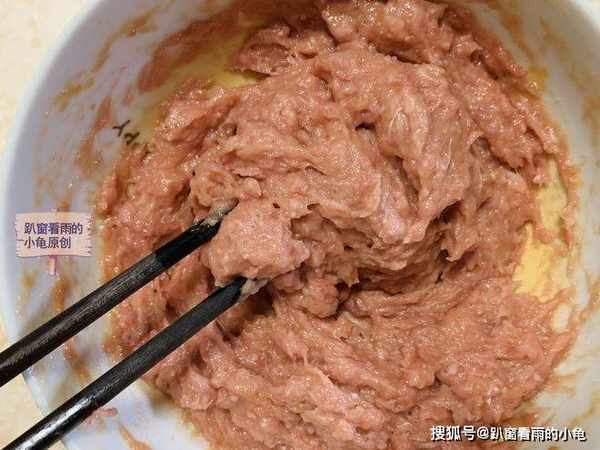 2:把准备好的肉馅放入碗中,少量慢慢地加入冷却后的花椒水,用筷子朝一个方向搅拌,让肉起劲,然后再加入姜末、少量料酒、生抽、香油、食盐,继续用筷子朝一个方向搅拌,直到搅拌均匀并且肉起劲。然后再将刺菜、少量香油、食盐与肉馅搅拌均匀备用。[注意:加入花椒水、料酒主要目的是给肉去腥。]