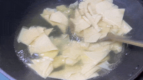 10. 锅内的水继续烧开,下入千张进行焯水