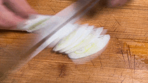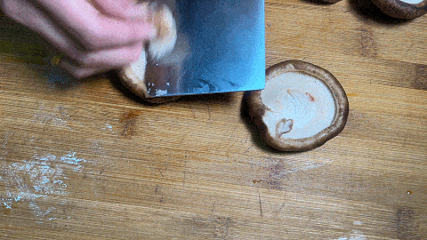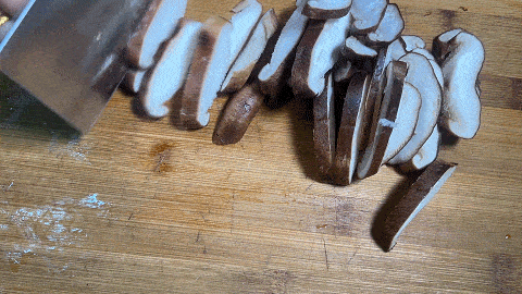 1. 香菇洗净,放在案板上去蒂,切成薄片