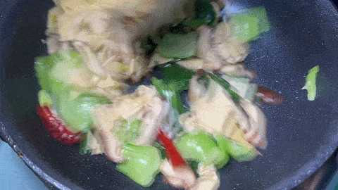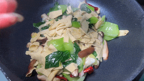 15. 翻炒均匀,倒入千张继续炒