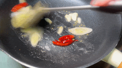 13. 起锅加入植物油,油热下入葱姜蒜和干红辣爆香