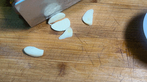 6. 大蒜几粒切成蒜片,生姜一块切成姜片,切好放入小碗中备用