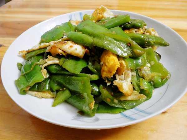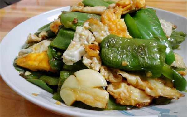 第二步,热锅放油,下大青椒段,炒到出虎皮,放蒜沫,翻炒均匀,然后下荷包蛋,关火。