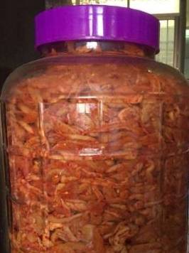 盐、辣椒粉,一起加入萝卜条拌均;装入玻璃罐,要压紧实;玻璃罐要无水,无油,干净的哦。