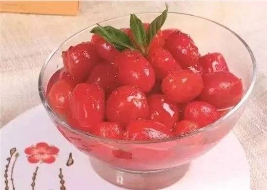 将圣女果高温油炸,去掉外皮后泡入冰糖水中,成菜质地松软,能充分吸收糖水的滋味,酸甜爽口,出菜迅速,毛利极高。