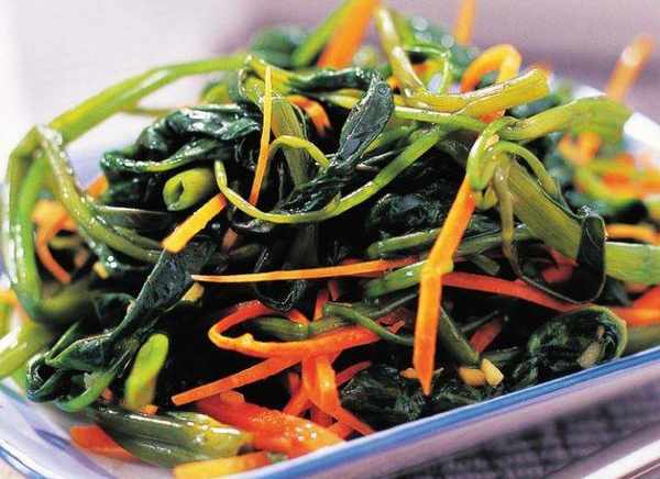 材料:空心菜750克,胡萝卜50克,姜蓉5克,精盐1小匙,米醋、香油各1/2小匙,植物油2大匙。