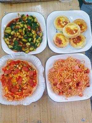 大赛现场气氛紧张而激烈,同学们系着围裙,洗菜、切菜、炒菜,各组选手配合默契,展示出精湛厨艺。不一会儿,干锅排骨、可乐鸡翅、天蚕土豆、炒鸡面、蛋挞……一道道色香味俱全的菜肴新鲜出炉,赢得在场师生连连称赞。随后,评委通过对每道菜的烹饪过程、菜品介绍和现场展示等相关环节的综合评定,最终评出了获奖作品。