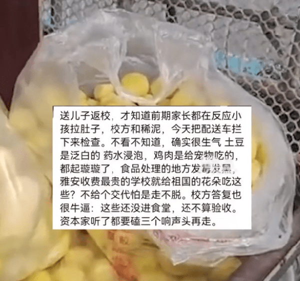 前不久,四川一所学校的学生家长反映,学生食堂的食材可能大有问题,有家长爆料,土豆是用药水泡过的,给孩子吃的鸡架原本是喂给宠物的,而肉类大部分是冷冻的骨头,不少学生在吃过食堂的餐食后出现腹泻的情况。