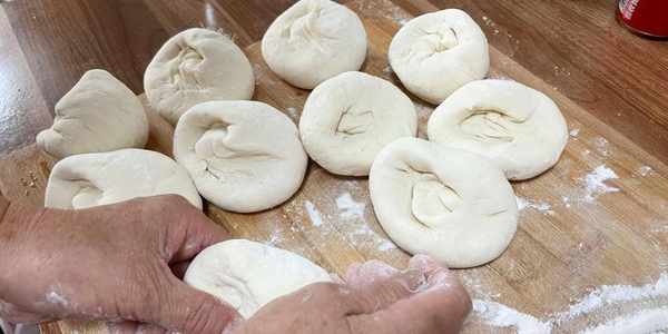 2、面团醒发好后打开锅盖会看到密集的小蜂窝,把面团从盆里面取出来放到案板上,使劲揉搓排气把蜂窝里的空气排出来,第一遍揉的不是很光滑,我们再把面团放入盆里醒发一小会,然后再取出来继续揉搓,直到揉成光滑的面团这时候面团就揉好了。揉好的面团把它搓出长条形状,用刀切出均匀的剂子,并用手揉搓团成馒头的形状。