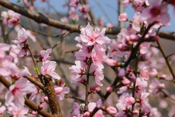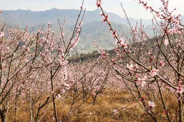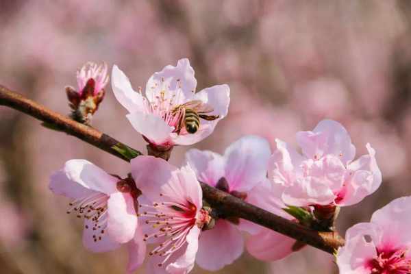 漫步桃林,有的迎风初绽、嫣然含笑;有的含苞待放、半藏半露。微风拂来,桃花散发出的清香沁人心脾,辛勤的蜜蜂沉醉在枝头大口吮吸,久久不肯离去。