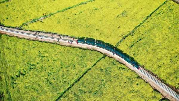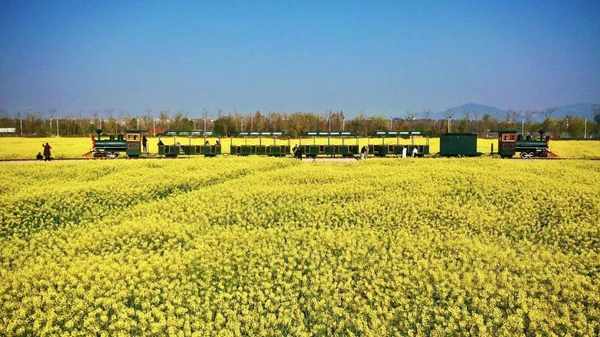 满目金黄百里香,一方春色惹人醉。除了乘坐小火车,油菜花海也吸引了不少游客和摄影爱好者前来观光拍照。绵延数里、金黄耀眼的油菜花绽放在蓝天白云之下,春风拂过,花枝轻轻摇曳,如“海浪”般翻涌而来,只需拿出手机或相机,一张记录春日盛景的“花海大片”就出炉啦。
