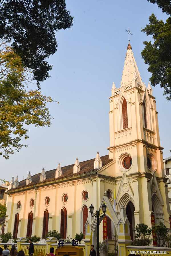 而仿哥特式的代表则是沙面大街14号的露德天主教圣母堂,它虽然是梁柱结构的建筑,但是外形仍仿哥特式,具有哥特式风格,立面主要门窗的山尖和塔楼四角的小尖塔组成,反映出天主教堂直通“天国”的特征,大堂,神父楼、修女楼、圣母山等配套建筑基本保存完好,其华美的造型也让这里成为了拍照打卡与拍婚纱照的好去处,可以说是岛上人气最高的地方之一,拍照排队是常有的事。