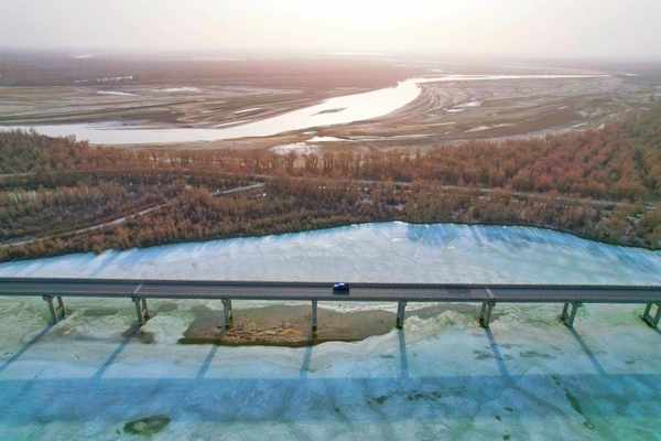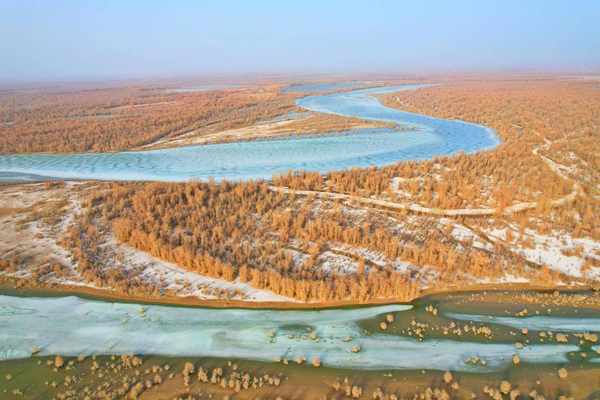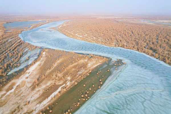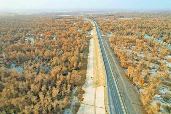春天的沙雅县,结冰的塔里木河和金黄色的胡杨林,组成了一幅辽阔深远的西域画卷,航拍的角度看,更加震撼。2019年,大桥建成,意义重大,方便了当地人和游客。