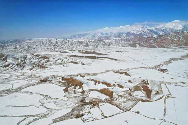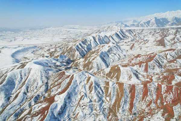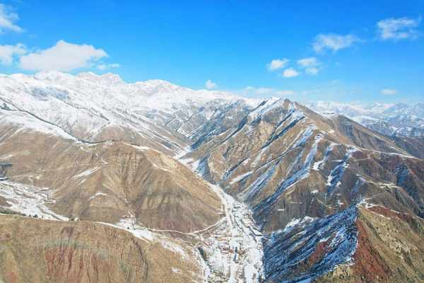 航拍的角度看天山托木尔博孜墩,可以感受这里的辽阔深远,朱红色的山体,在白雪皑皑之下,连绵起伏,直至天边,在这里可一次性领略草原、戈壁、雪山、冰川、河谷、雅丹地貌等绝美风景。眼前的画面纯净的让人想落泪,面对大自然,人类是多么的渺小,却又多么的坚强。
