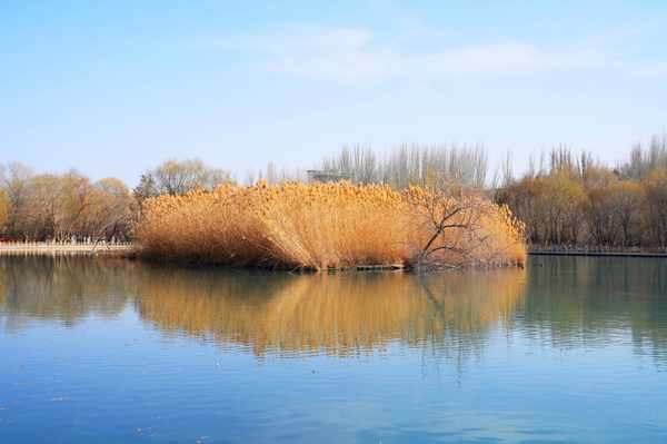 金黄色的芦苇,在阳光下闪烁在好看的光芒,水波涟漪的湖面上,野鸭子自在的游来游去,,燕泉山是南疆地区最具江南韵味和游览、观光价值的市内公园,有“塞外第一胜景”的美誉。