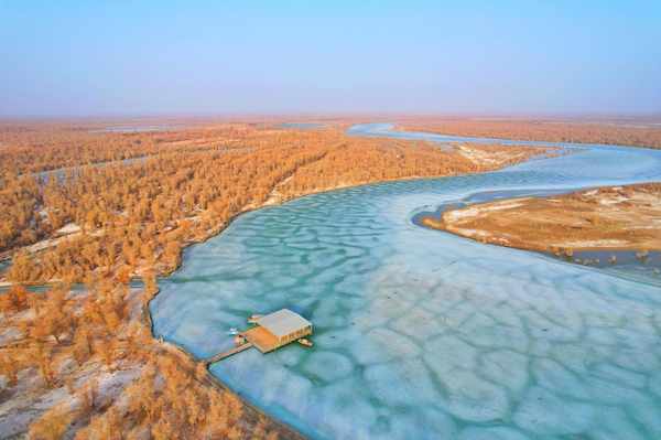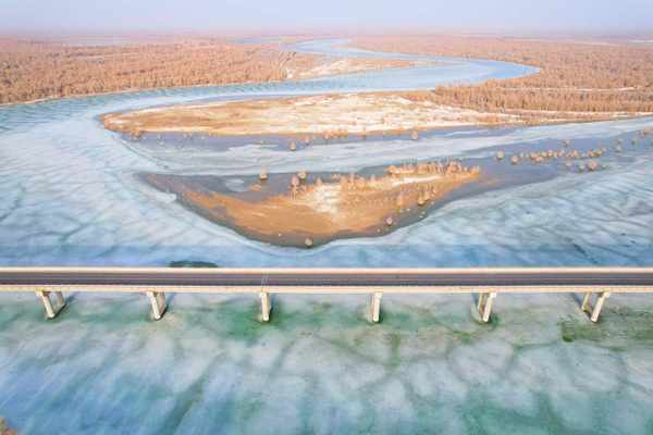 哈德墩大桥,下面就是结冰的塔里木河,还有苍凉的胡杨林,画面美极了。哈德墩大桥,是连接沙雅县哈德墩镇和塔里木乡的交通要道。以前的时候,这两个乡镇的人要到300多米的对岸,冬季要在冰面过河,看着眼前的画面,估计也很难走的,夏季要靠渡船,交通十分不方便。