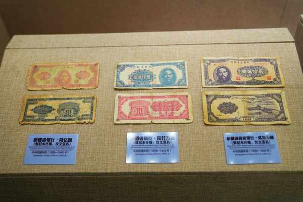 在参观钱币博物馆的时候,发现了一组纸币。这一组纸币面值都好大啊,是中国面值最大的纸币,1949年5月10日新疆国民党当局发行了面值为10位数的省币60亿圆券,但币值极微,只能买一盒火柴,需6000亿圆才能换大洋1圆,这也是一段历史的见证。
