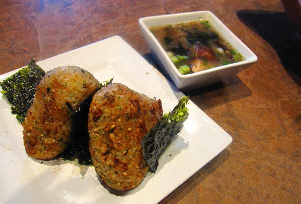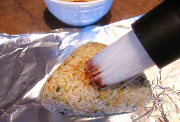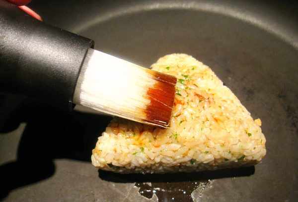 把饭团放在锡纸上,两面都涂上酱汁,然后在小烤箱里每面烤四到五分钟,或者直到金黄色。