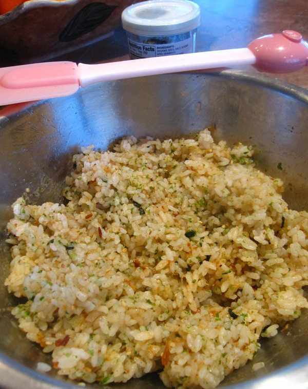 刚煮好的白饭,撒上肉松和三岛香松,搅拌均匀(这是个人喜好,只用白饭当然也可以)