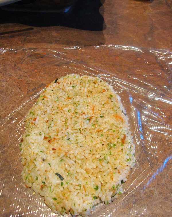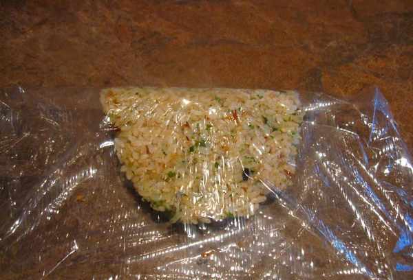 这样就是三角形的饭团基础。整颗饭团连保鲜膜拿起来,在手中把每边压紧压实,烤的时候饭粒才不会掉出来。
