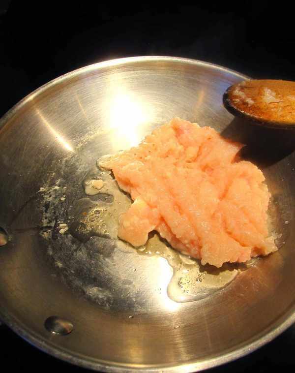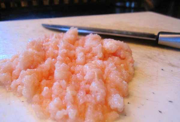 鸡胸肉剁碎。(半冷冻状态的鸡胸肉,先切薄片,再剁碎,很容易操作)