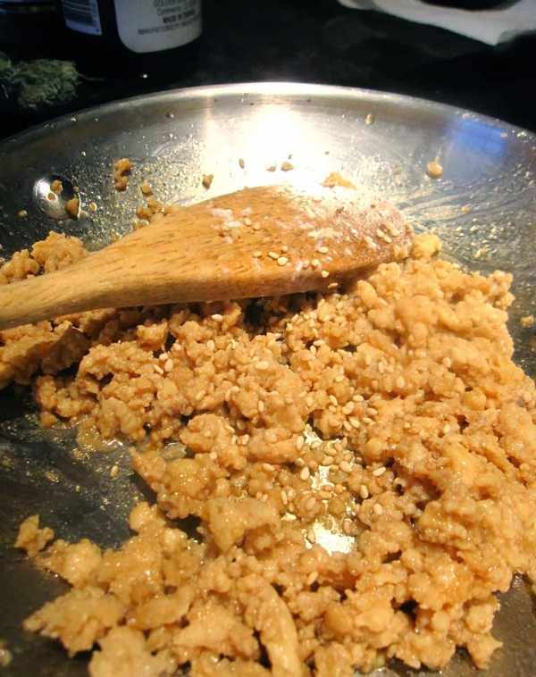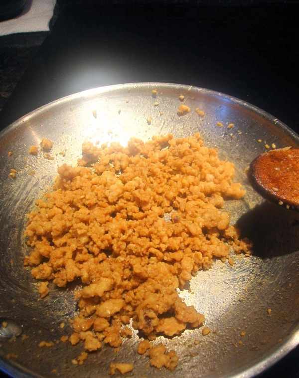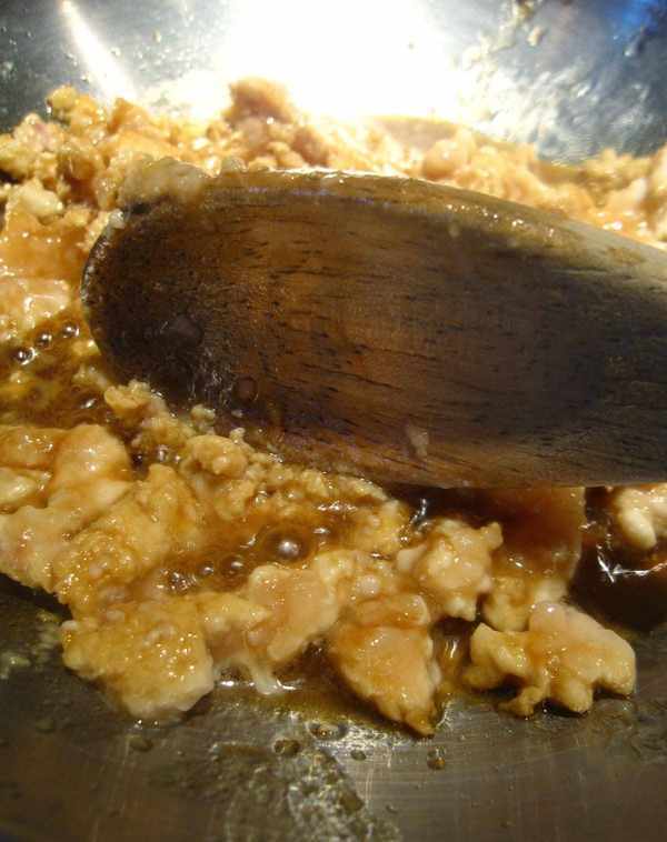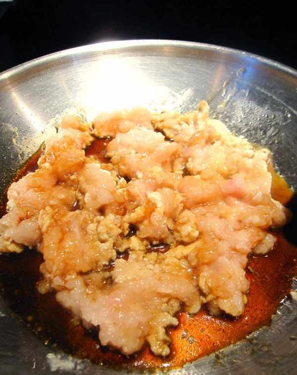 加了大概两滴油,开中火,把剁碎的鸡胸肉下锅拌炒;同时加入酱油、味霖、糖(这样一小块鸡胸肉,我放了约两大匙的酱油和味霖、半匙糖。因为要当作饭团内馅,咸一点没关系)