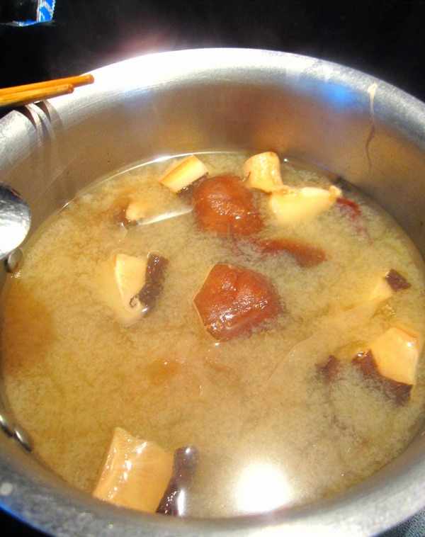 干香菇切小块,加入柴鱼片和干香菇,加水煮15分钟或至香菇熟透,关火,加入两大勺白味噌(根据个人口味调整)),煮两分钟.小火煮(煮至沸腾,味噌的香味不会散发出来),上桌前撒上葱花。