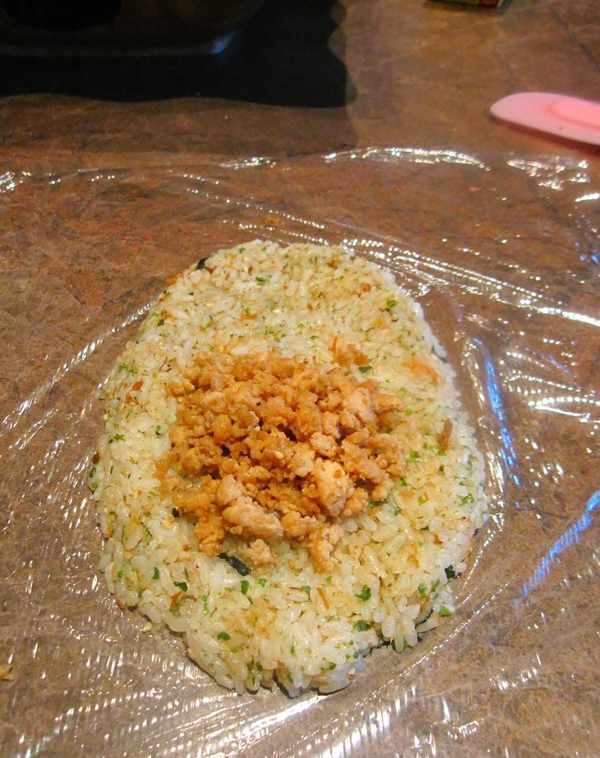 三岛香松、肉松鸡松(内馅可选择你喜欢的东西:梅子、烤鲑鱼、明太子((我个人最爱的饭团口味))、鸡蛋、小鱼,甚至直接包肉松也行。)