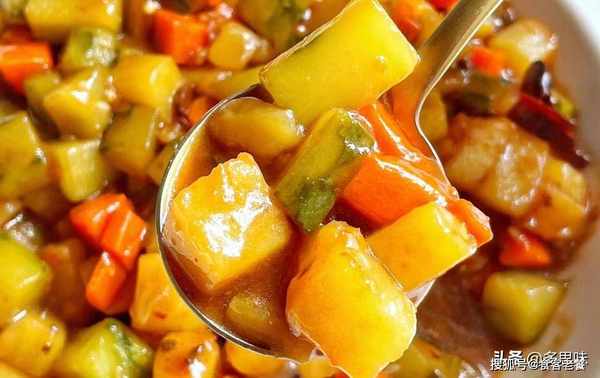 2,土豆、胡萝卜、黄瓜切丁,蒜末、辣椒段切好,起锅热油,加入土豆煎至微黄,加入胡萝卜一起煎熟