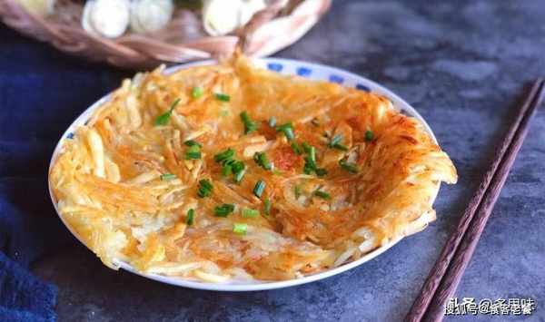 4一面定型以后,翻一面,用铲子压一压,小火继续煎。煎至两面金黄,出锅,撒葱花,还可以撒辣椒面。超级无敌美味的干煸洋芋(土豆)丝就做好了,好吃到停不下来,一盘都不够吃!