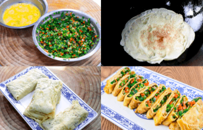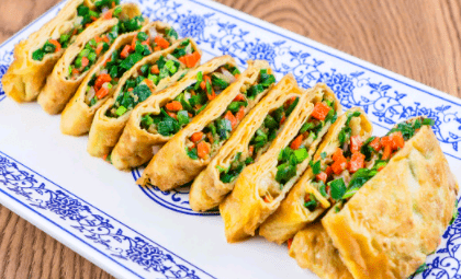 把锅烧热滑锅,滑好锅以后留少许底油。把锅稍微冷却一下,倒入四分之一的鸡蛋液,轻轻转动锅把蛋液平铺在锅底,定型以后淋入植物油,方便蛋饼脱离,蛋饼周围打卷时翻面,煎成金黄色时即可出锅。