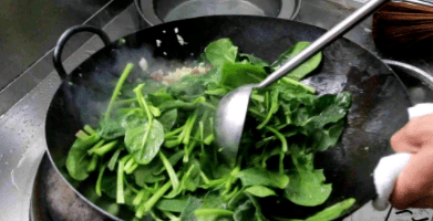 锅内滑油,倒入葱姜蒜以及干辣椒段爆炒出香味,下入菠菜,翻炒均匀。加入豆饼,翻炒几下后,稍微购入一点水淀粉,加入一点食盐即可出锅。