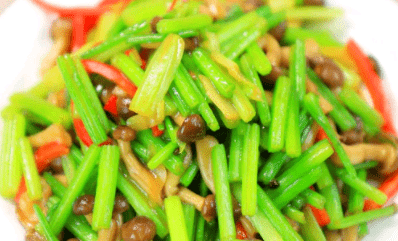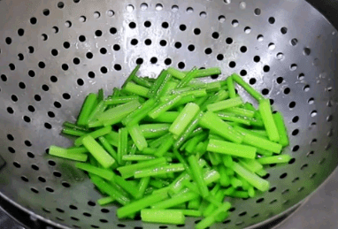 锅内烧油,油温五成热时倒入芹菜段翻炒1分钟左右,芹菜断生、返青以后加入少许食盐,转大火快速翻炒几下,倒出来备用。