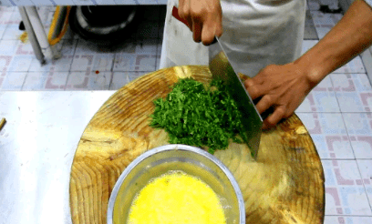 准备一个小盆,打入几个鸡蛋,加入食盐、鸡精,用筷子快速打散。搅拌混合,把香椿芽切碎,月份比较老的香椿叶,要在沸水中焯水40秒,然后过凉水切碎。把切碎的香椿芽和鸡蛋搅拌在一起。