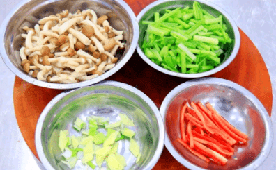 一把新鲜的蟹味菇,去除根部,放入清水中多抓洗两遍,把上面的杂质和灰尘洗干净,把比较大的芹菜从中间划开,切成段,洗干净备用。准备半根红椒,切成丝用来配色。切点葱花、姜片备用。