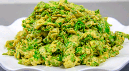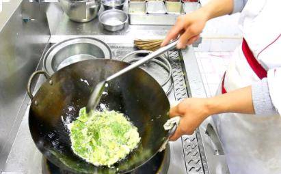 锅内烧油,热锅后充分滑锅,倒出热油,加入凉油,热锅凉油是为了让普通铁锅有了不粘锅的特性。倒入搅拌好的香椿叶,炒香椿叶鸡蛋是有技巧的, 不要刚倒入锅内就急着翻锅,先把香椿叶鸡蛋定型,定型后再翻锅,这样炒出来不易碎。成型后再翻炒几次就可以起锅装盘了。