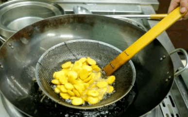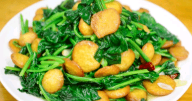 锅内烧油,油温六成热微微冒泡时倒入豆饼油炸。炸至金黄微焦时捞出备用。锅内倒油,下入洗净的菠菜翻炒几下,至菠菜断生后倒出备用。