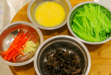 保持开小火,鸡蛋轻微打卷时,翻过来煎另一面,把鸡蛋煎至两面金黄后倒出。然后把煎好的鸡蛋皮叠在一起,切丝备用。锅内烧水,加少许植物油,倒入切好的木耳、莴笋,快速焯水30秒钟,莴笋断生返青以后倒出,用清水冲洗,冷却备用。