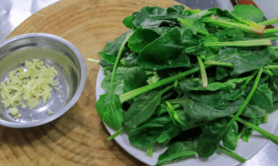 首先我们准备一把菠菜,清洗干净后捞出备用,大蒜几粒,用力拍散后切成蒜末,喜欢大蒜的,大蒜的量可以多一点。
