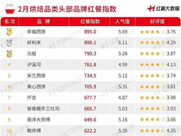 在2月份的烘焙品类分榜中,幸福西饼、好利来以及元祖占据前三席位,泸溪河、米兰西饼、美心西饼等紧随其后。